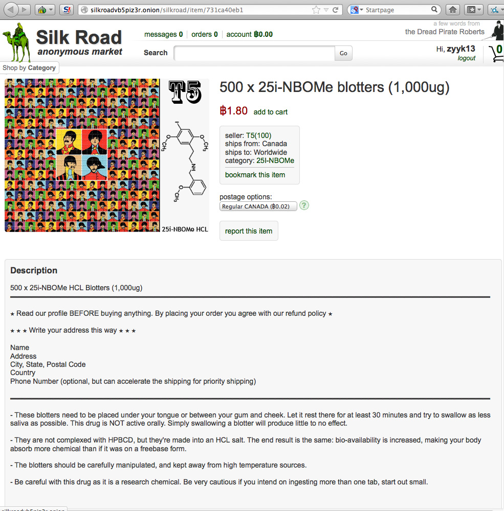 Silk Road prices for pure 25I-, 25C-, and 25B-NBOMe powder currently range from $90 to $200 per gram. The most problematic listings are vendors selling blotter that begs to be resold as acid: 1/4-inch perforated squares in 100-hit sheets bearing designs such as Albert Hofmann's bike ride and The Beatles Yellow Submarine, among other acid-blotter designs from the past. One vendor states "each tab is acid size, no big blotters here". Another offers hits supposedly containing 1 mg of 25I- and 25B-NBOMe each! Dosages range from 500 micrograms to 2 mg per 1/4-inch hit, with advertised doses averaging around 1 mg. On Silk Road, LSD blotter is 5-10 times more expensive than NBOMe blotter.