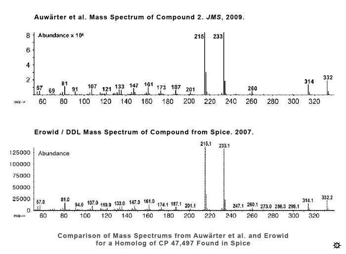 We were excited to find that the mass spectrums of the compounds that were identified in the Auwärter paper as the primary cannabinoid agonists in Spice, Spice Gold, and Spice Diamond, nearly exactly matched the results of our 2007 analysis. The CP 47,497 homolog was clearly the same chemical that our laboratory analysis had been unable to identify in the Spice we purchased and had analyzed some 20 months before Auwärter et al. purchased the Spice they analyzed.5
