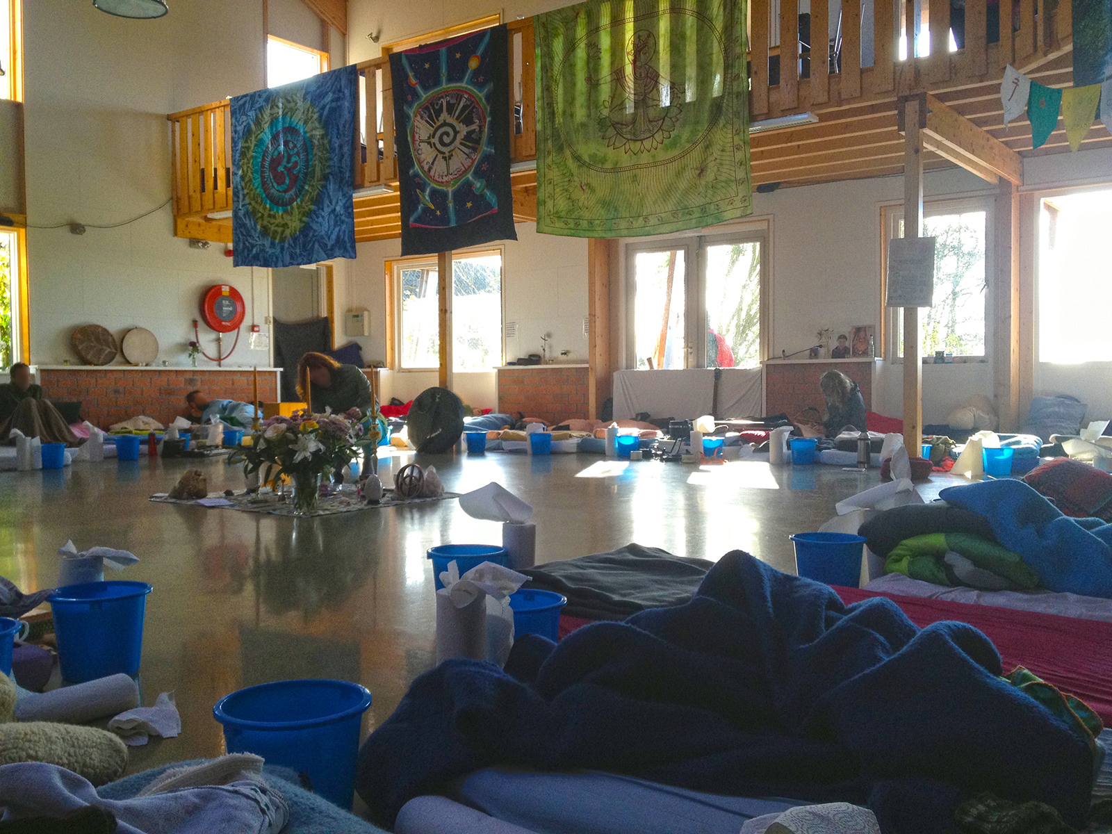 I don’t know if I made it or not. The next thing that I remember was more purging. One of the many truly excellent Helpers had apparently noticed what was about to happen before I did, and when I came around I was sitting up in loving arms and a bucket was right where I needed it to be. For a moment I was shaken and disoriented, and my new friend encouraged me to lean back in her lap while another woman came over and started softly playing one of my favorite Rainbow chants. I soon found that I was able to sing along, as did a number of other people in the room. It felt like my whole tribe was welcoming me home.
