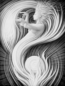 I personally believe that Visionary Art is a purest source projection of self into a creative endeavor. This is part intellectual and part trance. I feel that the Visionary Artworks that I have done were channeled through me. I become the vessel for the creation of the work. I am most happy when I feel this pulse of creation beating through me. Many times I enter trance states and will work for hours without food or water in frenzied excitement, as if possessed by the act of creation. This is an undeniable altered state of consciousness, a state of alignment with source.
