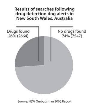 In 2001, a judge in Sydney, Australia ruled in Police v. Darby that the use of drug-sniffing dogs, without other probable cause to suspect an individual, was illegal. In response, the New South Wales (NSW) legislature passed a law allowing the general use of drug detection dogs and created an oversight role for an organization to track and review the use of the dogs. In 2006, the NSW Ombudsman issued an extensive report based on two years of data representing over 10,000 drug dog alerts.3 The review found that illegal drugs were found in only 26% of all searches that were initiated after a handler indicated that a dog alerted on the subject. The report softens the dismal performance by suggesting the false positives could be the result of "residual scents": after being searched and found not to possess any contraband, 60% of dog-alerted suspects "admitted to having had some contact with cannabis or to being at a place where cannabis was smoked."3 This unsubstantiated excuse for their deplorable success rate is offered by police despite their claim that dogs are "not trained to detect the odour of cannabis smoke". Improbably, some of the "residual scent" admissions collected by police were "related to drug use that was weeks, months and sometimes more than a year prior to the indication by the drug detection dog."3 Obviously this sort of remote past contact should not lead a detection dog to alert and establish probable cause for a search for current evidence.