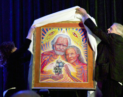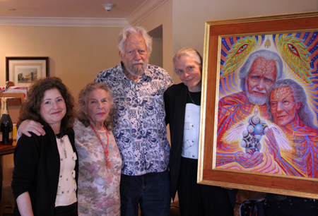 When planning our participation in the conference, it occurred to me that Erowid Center should sponsor a hospitality suite at the event, as a place where Erowid members could mingle during the off-hours for interesting discussions. We rented the largest suite available at the hotel for this purpose. Prior to setting up the room on Thursday afternoon, we offered it as a space for Sasha, Ann, and Alex Grey to autograph the limited edition prints of Alex's newest painting The Shulgins and their Alchemical Angels. I had been amazed to learn that the Greys still planned to attend the conference following their seriously injurious car accident in mid-March and was surprised that Alex had been able to finish the painting in time for the event. The money raised from selling these prints will support both CoSM's building of an exhibition hall and MAPS' upcoming MDMA/PTSD study. The painting itself was to be revealed to the public for the first time on Saturday night, during the dinner honoring these psychedelic elders.