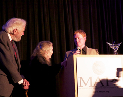 After the last speaker, a blown-glass "lifetime achievement award" was presented to the Shulgins by Rick Doblin and the artist Logan MacSporran, who had used some of Sasha's lab glassware as a source material in the caduceus-like figure.