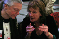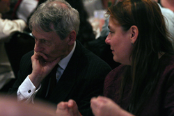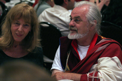 Earth and Fire and some others seated at the head table with the Shulgins dressed a little less formally than the suit-wearers. While many of the men at the head table wore suits or jackets and slacks, slightly less than half wore something differently formal, like nice button-up shirts, formal religious robes, black Utilikilts, or other dressy gear. Since "formal" mostly means "fancy" for women, all of the women were dressed appropriate to the MAPS guidelines. Perhaps the award for cutest outfits goes to the Greys for their matching white-plastic "turtle shell" body braces under black his-and-her suits. Overall, MAPS' dressing guidelines seemed to result in a media-appropriate smattering of weird, along with the formalwear.