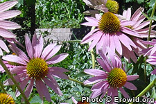 Perennial herb that resembles a black-eyed Susan and grows 1-2 feet tall. Its sturdy stems are covered with tiny, bristly hairs and its pale to dark green leaves are pointed and 3-8 inches long. The large daisy-like flowers are pink or purple with petals arranged around a bristly central cone.