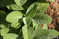 Salvia officinalis is an aromatic, evergreen perennial, growing up to 2 feet tall, with 1.5-2 inches long leaves that are wooly, oval shaped, and grayish. The violet-blue flowers are arranged on the ends of squarish stems and branches. Contains thujone in essential oil.
