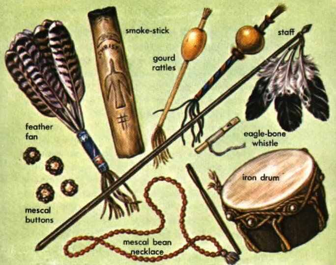 Paraphernalia used in a typical Plains Indian peyote ceremony.