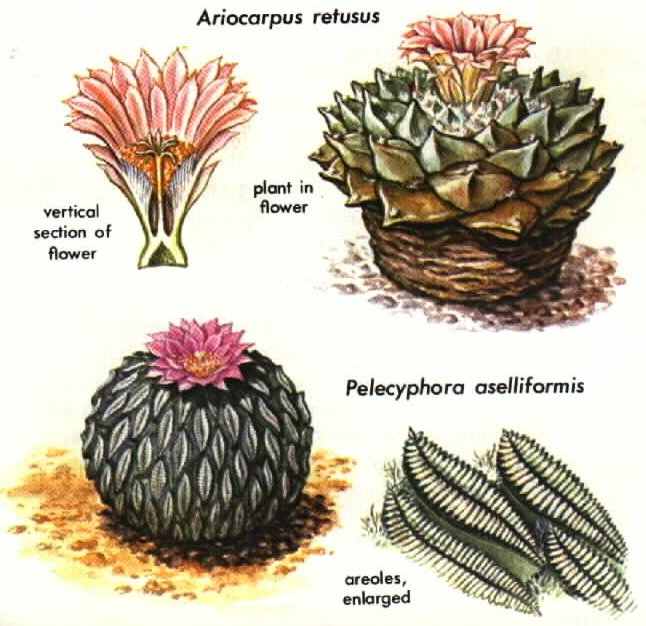 Nothing is known of the chemistry of Epithelantha. Several toxic alkaloids, especially anhalonine, have been found in Ariocarpus, but mescaline is apparently absent. Pelecyphora aselliformis, another "false peyote," has recently been found to contain alkaloids.