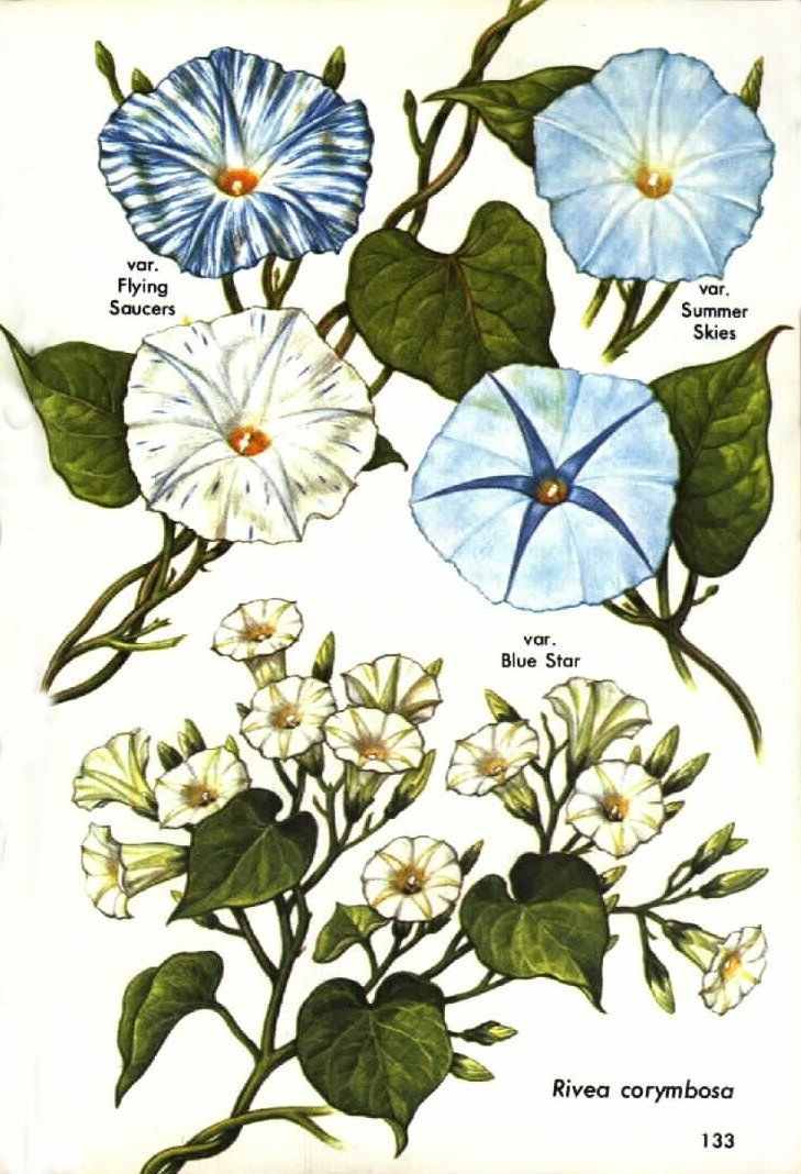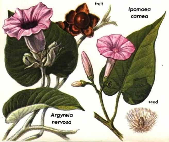 MANY HORTICULTURAL VARIETIES of Ipomoea violacea, including the popular ornaments Heavenly Blue, Pearly Gates, Flying Saucers, Blue Stars, and Wedding Bells, as well as other varieties of Ipomoea, contain hallucinogenic constituents. Other genera, notably Argyreia and Stictocardia, also contain these substances. The Hawaiian wood rose (A. nervosa), for example, has been found to be highly intoxicating. Seeds of I. carnea, which are known to possess biodynamic constituents, are said to be used as hallucinogens in Ecuadorian folk medicine. In fact, hallucinogenic compounds are so prevalent in this family, both geographically and botanically, that it is difficult to explain why the morning glories have not been more widely employed as narcotics by primitive societies. Or have they?