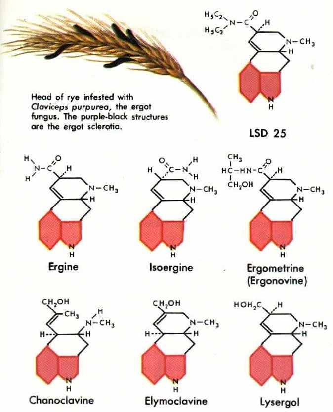 His astonishing discovery met with widespread disbelief, partly because these Iysergic-acid derivatives had hitherto been known in nature only in the primitive fungus ergot (Claviceps purpurea), a parasite on the grains of rye in Europe, when ergot was accidentally ground up in a mill with rye flour and eaten in bread made from the flour, it poisoned whole towns, causing a terrible intoxication and leading frequently to widespread insanity and death. In the Middle Ages, before causes were understood and preventative measures taken, these mysterious mass attacks were called St. Anthony's Fire and were attributed to God's wrath.