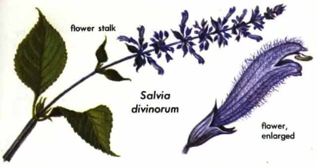 HOJAS DE LA PASTORA (Salvia divinorum), of Mexico, Is the only one of 700 species of Salvia known to be used as an hallucinogen. Mazatec Indians of Oaxaca employ the leaves as a divinotory narcotic, hence divinorum ("of the diviners"). The Mazatecs call the plant hojas de la Pastora in Spanish and shka-Pastora in their native tongue, both names meaning "leaves of the Shepherdess." The leaves are chewed fresh, or the plonts are ground on a metote, then diluted with water and filtered for drinking.