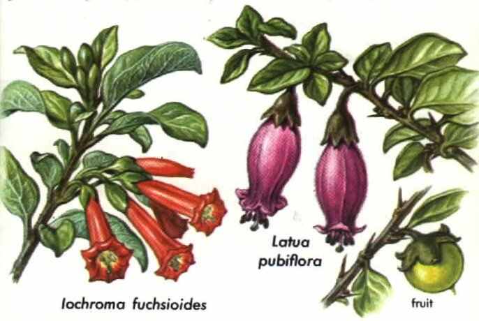 BORRACHERA (lochroma fuchsioides) is one of about two dozen species of lochroma, all native to the highlands of South America. There are suspicions and unconfirmed reports that several species of lochromo are locally taken in hallucinatory drinks, either alone or mixed with other narcotic plants, by Indians in the Sibundoy Valley of southern Colombia. Although no chemical studies have been made of lochroma, it belongs to the nightshade family, Solanaceae, well recognized for its toxic and hallucinogenic principles.
