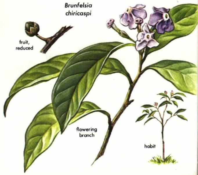 CHIRIC-CASPI and CHIRIC SANANGO (Brunfelsia) are the most common of the native names for several species of shrubs that appear to have been important hallucinogens among some South American Indian tribes. The use of the name borrachero, which means " intoxicator," indicates that the natives of Colombia, Ecuador, and Peru recognize the shrub's narcotic properties, and the special care taken in its cultivation seems to suggest a former religious or magic place in tribal life. Recently, real evidence has pointed to the use of several species of Brunfelsia either as the source of an hallucinogenic drink, as among the Kachinaua of Brazil, or as an additive to other hallucinogenic drinks, as among the Jívaro and Kofán Indians of Ecuador.