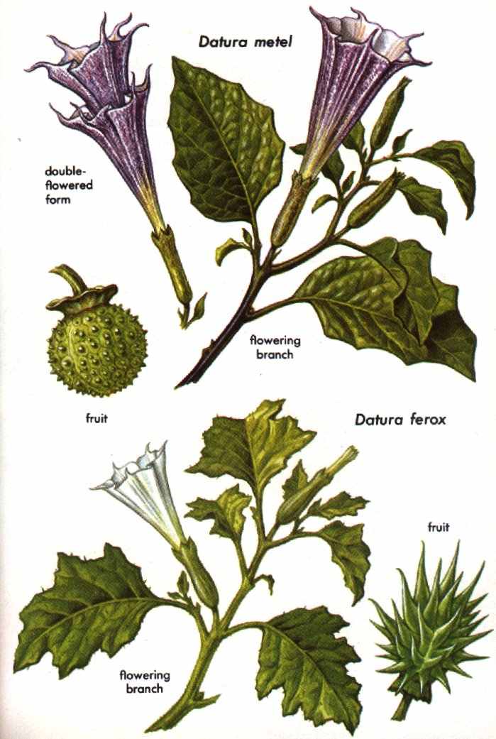 The plant contains highly toxic alkaloids, the principal one being scopolamine. This hallucinogen is present in heaviest concentrations in the leaves and seeds. Scopolamine is found also in the New World species of Datura (pp. 142-147). Datura ferox, a related Old World species, not so widespread in Asia, is also valued for its narcotic and medicinal properties.