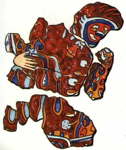 Detail from a fresco at a Tepantitla (Teotihuacán Mexico) representing Tloloc, the god of clouds, rain, and waters. Note the pale blue mushrooms with orange stems and also the "colorines' - the darker blue, bean-shaped forms with red spots. See pages 90 and 97 for discussion of colorines and piule. (After Heim and Wasson.)