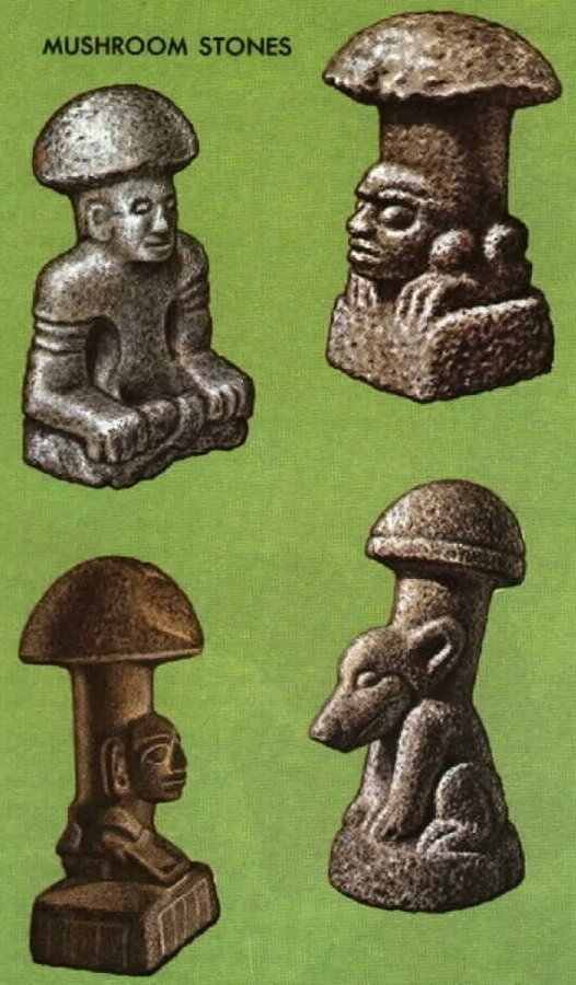 MUSHROOM WORSHIP seems to have roots in centuries of native tradition. Mexican frescoes, going back to A.D. 300, have designs suggestive of mushrooms. Even more remarkable are the artifacts called mushroom stones (p. 60), excavated in large numbers from highland Maya sites in Guatemala and dating buck to 1000 B.C. Consisting of a stem with a human or animal foce and surmounted by an umbrella-shaped top, they long puzzled archaeologists. Now interpreted as a kind of icon connected with religious rituals, they indicate that 3,000 years ago, a sophisticatedreligion surrounded the sacramental use of these fungi.