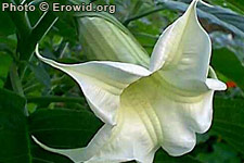 Brugmansia is a small to mid-size tree with large, strong-smelling, trumpet-shaped flowers hanging downward. Most parts of the plant contain atropine, scopolamine and hyoscyamine. It has been used as an admixture plant in ayahuasca brews as well as in poisons and medicines in S. America.