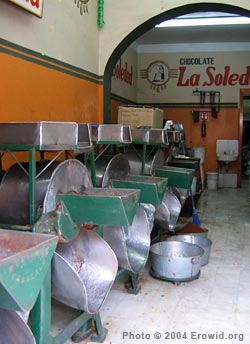 of grinding machines, a small counter, and a shelf full of packaged chocolate for sale.Shelled cacao beans are poured by the bucketful into the grinders, emerging as a thick dark paste called "cacao liquor" or "chocolate mass". To most batches, copious amounts of sugar are added and the mass is passed through the grinder again, which mixes the sugar with the ground cacao beans, creating "chocolate". Depending on the desires of the purchaser, almonds, chiles, or cinnamon might also be added. The resulting chocolate is a course, grainy material with the consistency of brown sugar. In some shops, the same grinders are used to grind chiles and tomatoes into salsa--just a quick rinse with a hose and the grinder is ready for the next job. Standing nearby when they're grinding chiles is like standing in a cloud of pepper spray.