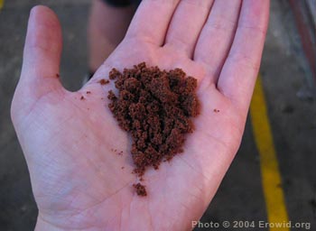 Shelled cacao beans are poured by the bucketful into the grinders, emerging as a thick dark paste called "cacao liquor" or "chocolate mass". To most batches, copious amounts of sugar are added and the mass is passed through the grinder again, which mixes the sugar with the ground cacao beans, creating "chocolate". Depending on the desires of the purchaser, almonds, chiles, or cinnamon might also be added. The resulting chocolate is a course, grainy material with the consistency of brown sugar. In some shops, the same grinders are used to grind chiles and tomatoes into salsa--just a quick rinse with a hose and the grinder is ready for the next job. Standing nearby when they're grinding chiles is like standing in a cloud of pepper spray.