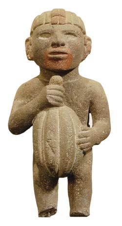 Several other Aztec gods are also associated with cacao. Tlaloc, the Aztec god of rain and fertility, was asked by Quetzalcoatl to nourish the cacao tree with water after it was planted. And Xochiquetzal, the Aztec goddess of love, was tasked with adorning the cacao with flowers; some depictions of her include a vessel of cacao beverage, adorned with flowers.7 Unfortunately, because most of the pre-Columbian writings of southern Mexico were destroyed by the Spanish, much of what is known about early uses of chocolate is based on cryptic archaeological evidence (such as the residue in early pottery) and writings from the sixteenth century. Images of cacao trees, cacao pods, and cacao-related glyphs appear on Olmec, Mayan, and Aztec frescos, pottery, and stone carvings from the late pre-Classic period (250 CE) onward.8