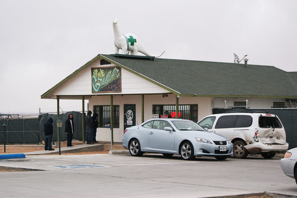 Upon exiting the freeway at the first cannabis shop most out-of-state visitors encounter, I am thrilled but also quickly turned off. The establishment is a worn, whitewashed house with a dinosaur on the roof and a greenhouse out back. It's located in a setting where one might expect to find a body in a burned-out car, not jars of legal recreational marijuana. A light rain begins to fall as I stand in line outside for 20 minutes before entering.