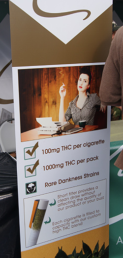 The exhibitions are much more cannabis-focused than at the BIG Industry Show. Rather than all-things-head-shop, this is all-things-weed. The nicotine e-cigs are gone, as is the kratom, replaced with, among others, a company promoting 10-pack tins of filtered cannabis cigarettes. These stoke a special interest for me because of a story a family member once told me: He claimed that during the Vietnam War, he saw fields of cannabis being grown by US tobacco companies, as well as their four-joint packaging. "They were ready to pounce on the market once marijuana was legalized, which they felt was imminent." This filtered cannabis cigarette business is now realized, and takes itself seriously: Each cannabis cigarette is standardized to contain 100 mg of THC (roughly the equivalent of a gram of good bud) in a blend of strains: Ghost Train Haze, Scott's OG, and Larry OG. Sadly, smoking these machine-rolled joints isn't as satisfying as expected. The filter prevents getting a nice draw, resulting in more time that the product just burns. All that goodness going up in un-inhaled smoke. I love the idea, but they need work.