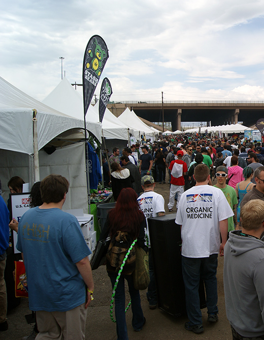 April 19. Tremendously long lines of humans wind around several buildings at the Denver Mart (including a local sheriff's substation), along the edges of the filled-to-capacity parking lot, beyond the fenced entrance, and down nearby sidewalks. Pleasant, but not entirely helpful, security personnel occasionally walk along the lines to holler, "You cannot bring more than one ounce of marijuana into the building!", like bouncers telling the assembled queue at a concert that recording devices are not permitted.