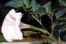 Datura is a woody-stalked, leafy herb growing up to 2 meters. It produces spiney seed pods and large white or purple trumpet-shaped flowers that face upward. Most parts of the plant contain atropine, scopolamine, and hyoscyamine. It has a long history of use both in S. America and Europe and is known for causing delirious states and poisonings in uninformed users.