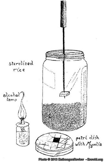 The reason that such equipment was necessary was that the McKennas primarily reproduced the existing 1932 patent of Sinden. Mushroom spores were first germinated on agar, and the resulting mycelium was transferred to grain jars. To speed up the colonization of the substrate the grains had to be mixed every few days by shaking the jars. Because brown rice usually is too sticky to be shaken, the authors recommended the less productive (and in urban environments often difficult to obtain) rye grains. Finally the colonized grains had to be covered with a casing mixture. In the laboratory all these steps are performed in a sterile work-space. The average basement shaman lacks such an environment, and unfortunately all the McKennas offered as a solution was a poorly designed glovebox.
