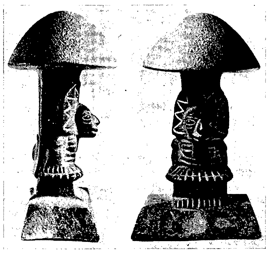 The use and the worship of these mushrooms by the Indians of Central America must be very ancient. In Guatemala so-called "mushroom stones" have been found. These are stones carved in the form of a pileate mushroom, in the stem of which the head or entire figure of a god is depicted (fig. 1). The oldest specimens found are over three thousand years old. It can therefore be concluded that the mushroom cult of the Indians dates back to more than thousands of years before Christ. More detailed historical data can be found in the monograph of the Wassons' "Mushroom, Russia and History" ([1] ).
