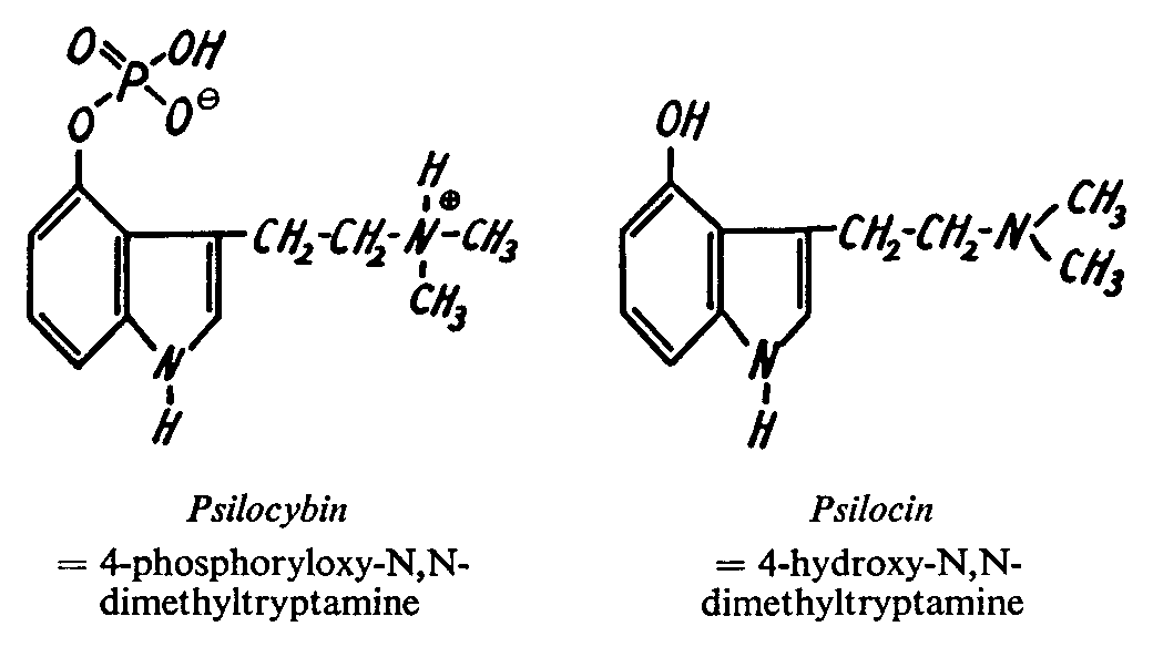 Psilocybin is a stable compound which is readily soluble in water and which is obtained in colourless crystals. Psilocin on the other hand is very sensitive to oxidation and difficultly soluble in water. Psilocybin is the first and only hitherto known natural indole compound which has a phosphoric acid radical. Psilocybin and psilocin are also novel in that they are substituted in the 4-position of the indole structure by a hydroxy radical.