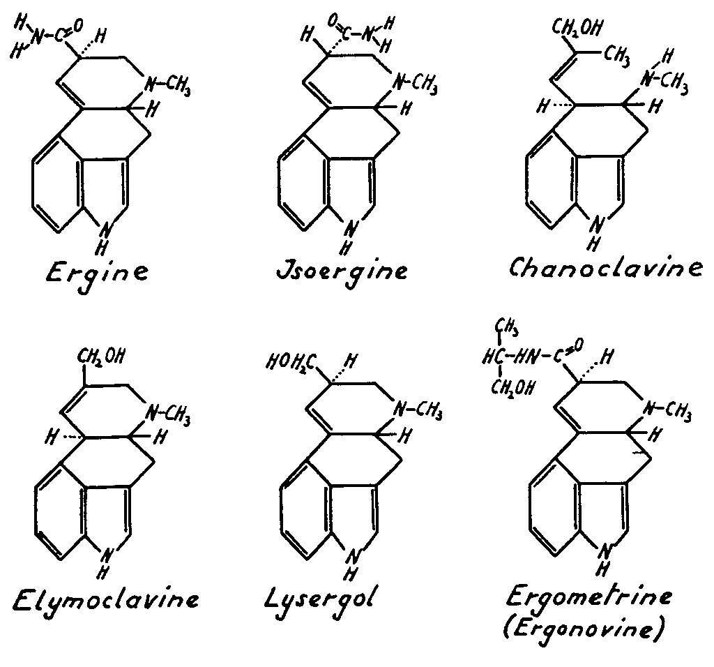 The main component in both seeds is d-lysergic acid amide also called ergine. In later investigations it was found that ergine and isoergine were present in the seeds to some extent in the form of their condensation product with acetaldehyde, i.e. d-lysergic acid hydroxyethylamide and d-isolysergic acid hydroxyethylamide resp. The latter compounds are very easily hydrolyzed in the course of the extraction process to provide ergine resp. isoergine and acetaldehyde. Lysergic acid amide and isolysergic acid amide together with the corresponding hydroxyethylamides were found earlier also in ergot of Paspalumgrass ([46] ). Chanoclavine has previously been discovered in ergot of the tropical millet cob Pennisetum typhoideum Rich ([47] ). Elymoclavine was first isolated from ergot of the wild grass Elymus mollis Trin ([48] ). Lysergol was produced synthetically by reduction of d-lysergic acid ([49] ) before it was discovered to occur in nature as one of the active principles of ololiuqui. Ergometrine (ergonovine) is the alkaloid which is mainly responsible for the ultero-tonic hemostatic action of the ergot drug. It can also be obtained synthetically ([50] ).