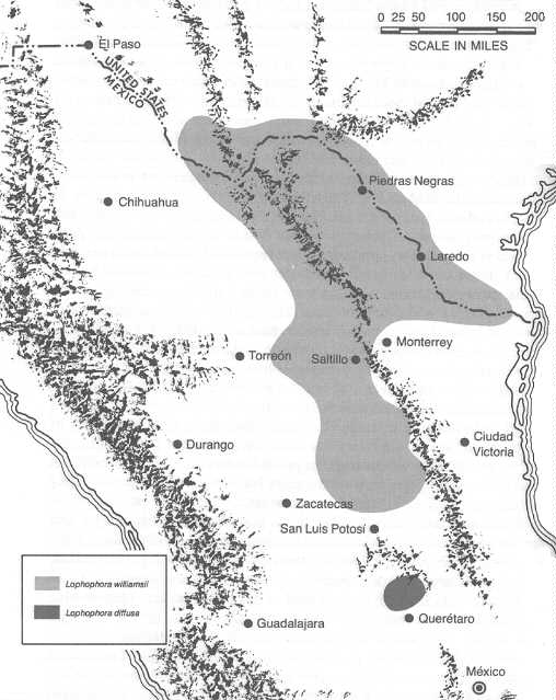 Fig. 8.2 - Natural Distribution of the two species of peyote, Lophophora williamsii and Lophophora difusa |