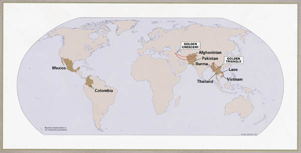 Heroin is derived from raw opium gum, which is produced only by the opium poppy plant, although other varieties of poppy exist. The California, Flanders, and Oriental poppy are three types grown domestically. Poppy--both the opium-producing and non-opium-producing varieties--can be found in many different climates all over the world. Opium poppy has been grown in Asia for many years, and more recently has been cultivated in Latin America. About 60 percent of the world's opium is produced in the remote parts of Southeast Asia, especially in the aptly named Golden Triangle, which includes parts of Burma, Laos, and Thailand. Other primary growers include Afghanistan, Pakistan, Colombia, and Mexico.