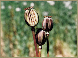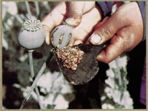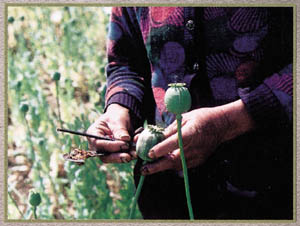 Just before reaching maturity, the poppy plant produces a flower. After about a week, the flower petals fall off, leaving a capsule. Raw opium gum is harvested from this capsule. The surface of the capsule is cut, or "scored," with a knife containing three or four small blades, and the opium gum oozes out through these cuts. The next day, the farmer scrapes the gum off the capsules with a flat tool called a scraper. Each capsule is usually scored in this manner three to five times, or until scoring produces no more gum. Poppyfields contain thousands of poppy capsules, so harvesting is very labor intensive. Once the gum is collected, the farmer sets it out to dry for several days, then wraps it in banana leaf or plastic. The gum is stored until a trader comes to the village--opium gum has a very long shelf life and can gain value over time. After the harvesting process is complete, the capsules are cut from the stem, allowed to dry, then broken open so that the seeds inside the capsule can be used for next year's crop.