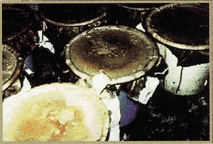 Refining raw opium into heroin is a tedious, multistep process. Once the opium gum is transported to a refinery, it is converted into morphine, an intermediate product. This conversion is achieved primarily by chemical processes and requires several basic elements and implements. Boiling water is used to dissolve opium gum; 55-gallon drums are used for boiling vessels; and burlap sacks are used to filter and strain liquids. When dried, the morphine resulting from this initial process is pressed into bricks. The conversion of morphine bricks into heroin is also primarily a chemical process. The main chemical used is acetic anhydride, along with sodium carbonate, activated charcoal, chloroform, ethyl alcohol, ether, and acetone. The two most commonly produced heroin varieties are No. 3 heroin, or smoking heroin, and No. 4 heroin, or injectable heroin.