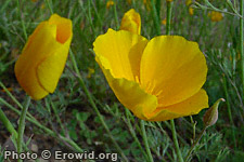 Eschscholzia californica is a perennial herb growing approx 30 cm tall. Leaves are greyish green and finely divided. Four petalled flowers range from white to red, though most commonly orange and yellow. It is the state flower of California. Does not contain opium.