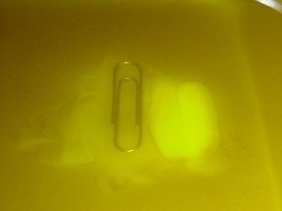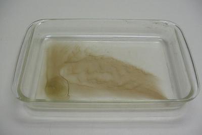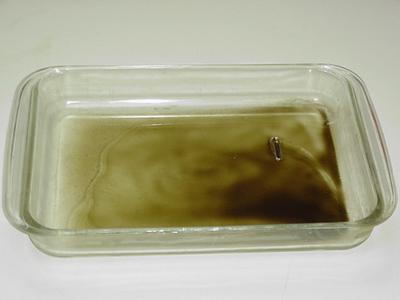 30 minutes after pouring the extract in this pan you can see the tannin sediment that is still falling out of the fluid. I wiped a spot clean on the bottom and placed a paper clip there to show that the fluid is still cloudy. Should be clear. |