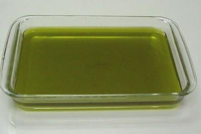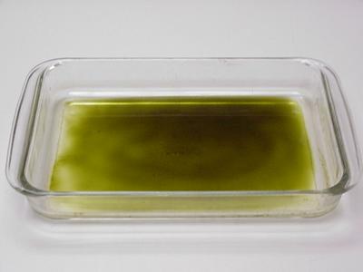 IPA extract in flat pyrex pan: All of the IPA from the multiple extractions were combined together in one container which was left to sit still undisturbed for several hours so that the sediments would have time to settle out of the fluid. |