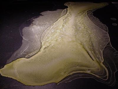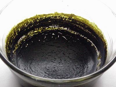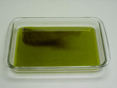 Dried extract: stopped washing the Salvinorin and dried it on a Teflon cookie sheet in an oven set to 120 degrees F. You can see that the choloropylls dried on top, as always. |