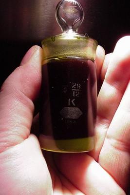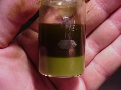 The bowl I dried the concentrated IPA extract in, the vial I use to wash waxes out of the crude extract and the green Naptha from the seven washes. |
