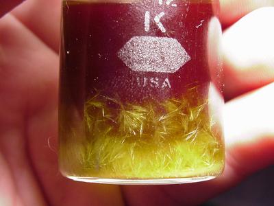 I reheated and dissolved the crystals four times trying to grow better crystals. The forth and subsequent reheatings and dissolving of the crystals did not produce better formations and only caused further losses of Salvinorin. Although I used a microwave oven to heat this solution, using hot water would be far better due to more even heating. Also, there is some danger of vapors being ignited in a microwave oven or the bursting of your glass container if pressure is unable to vent. |
