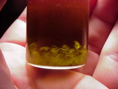 Crystals grown from this extract when dissolving all of the powder in about 25 ml of 135-140 degree F. 151 proof alcohol. I reheated the Salvinorin-saturated alcohol in this vial with a microwave oven to almost boiling, three times, letting the solution cool to room temperature each time. After the third heating and cooling cycle these large crystals formed. |