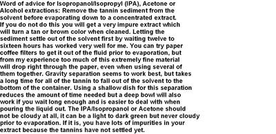 Do not use 70% Isopropanol for this method because it will not efficiently extract Salvinorin. A 94% Isopropanol (or 190 proof Everclear) might work for this quick extraction method, but I have not tried using it myself. I will not use 70% Isopropanol because it has far too much water in it, slowing down the efficiency of the alcohol, which requires a much longer soaking to extract out the Salvinorin. Also, the added water with 70% IPA increases the amount of tannin extracted because it is extremely soluble in water, but not very soluble in alcohol. An extraction of powdered leaf using 151 proof alcohol -- which is close to 25% water -- might work, if you let it soak several days. You can use 190 proof Everclear drinking alcohol for extracting leaf instead of Isopropanol if you soak the leaf long enough, and it would be far better than using 151 proof Everclear. However, I have not tried 190 proof because it is illegal where I live. The 190 proof might not be suitable for this quick extraction method because it has close to 5% water in it. I have seen how inefficient 70% Isopropanol works for this quick method and how much tannin that it extracts out of the leaf. Because of this I have since sworn off alcohols that contain more than 1% water, when in fact I don't know how well 95% alcohol might work for a quick extraction.