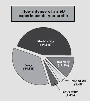 We were pleased and surprised when we reached our target of 500 complete responses within a matter of weeks. In that time, the study questionnaire was viewed 1298 times, with 520 viewers (40.1%) submitting a completed questionnaire. 500 of 520 (96.2%) responses were usable. Data were excluded from analysis if (1) the response was incomplete, (2) the participant reported having previously completed the survey, (3) the participant reported he or she was not fluent in English or had difficulty understanding the questions, (4) another response was submitted from the same computer within ten minutes, or (5) the participant reported no use of SD. 92.6% of respondents were male. It is not clear whether this is representative of SD users or simply those who were willing to participate in our survey. Average age was 23.4 years old (range of 13–68) and 77.4% live in the United States. 80.6% reported they would probably or definitely use SD again.