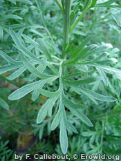 Wormwood refers to several species in the genus Artemisia in the Compositae family. It most often refers to Artemisia absinthium, a perennial, shrubby herb native to Europe, North Africa, Asia, and North and South America. Wormwood is famous for its extremely bitter taste. Its whitish-grey fuzzy leaves give off a strong, acrid smell when crushed. Wormwood oil is largely composed of thujone, a psychoactive terpene that is chemically similar to camphor. Today it is best known as the primary additive to the liquor absinthe. Less commonly, wormwood has been smoked or brewed into tea for its psychoactive effects. Despite its reputation, wormwood is not a hallucinogen. Like camphor, thujone causes seizures in sufficient dose ranges, and can be fatal.