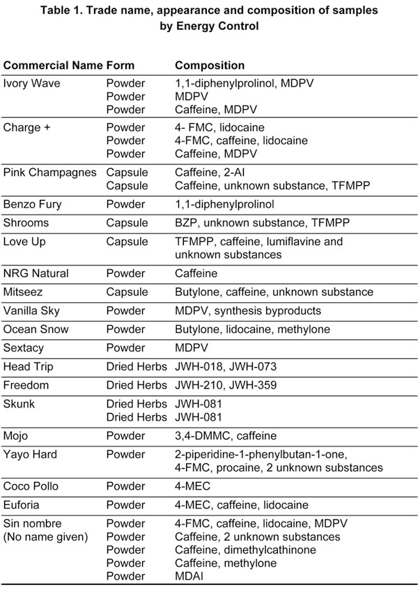 - A 29th sample was included in the table above. For more details about legal high samples tested by Energy Control, see ecstasydata.org/results.